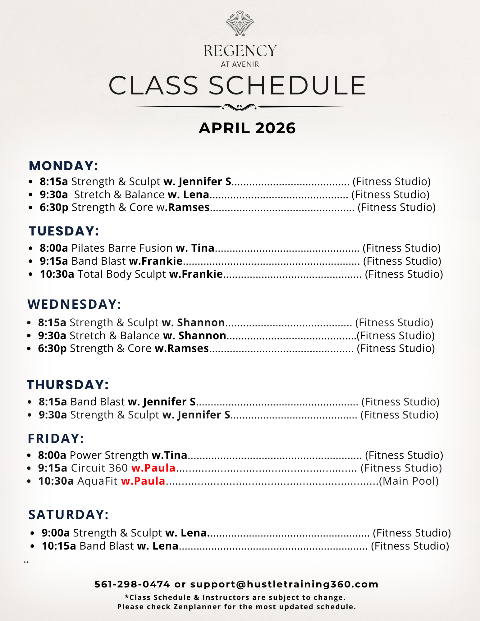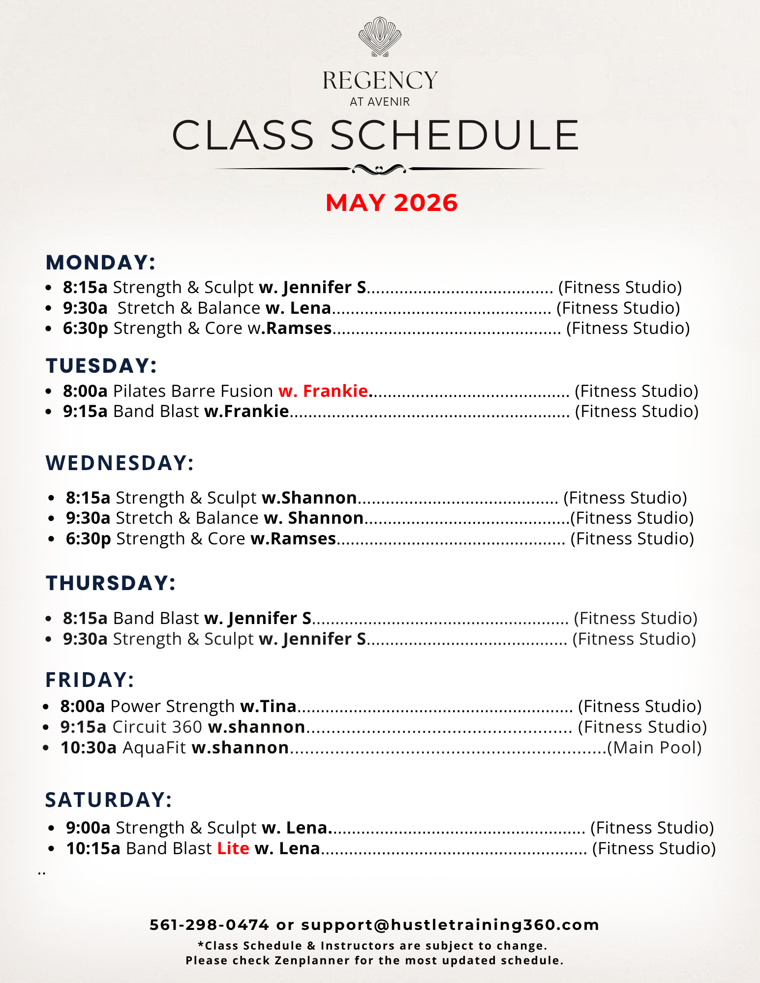 All classes available at Regency at Avenir. Check the monthly calendar above for specific days and times.
